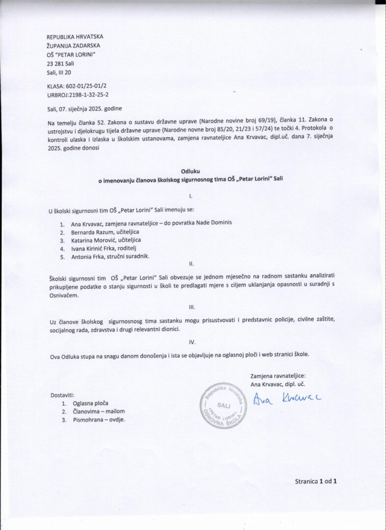 Zakoni i Pravilnici PRAVILNICI Items per page Loading 2026-01-12, Pravilnik o izmjenama i doopuni Pravilnika o sistematizaciji radnih mjesta u OŠ Petar Lorini Sali 284 KB Download 2025-03-31, Pravilnik-o-kucnom-redu-2025 471 KB Download Pravilnik o zaštiti od požara 123 KB Download Pravilnik o zaštiti na radu 238 KB Download Pravilnik o zapošljavanju u OŠ Petar Lorini 175 KB Download Pravilnik o vrednovanju učenika 132 KB Download Pravilnik o unutarnjem ustrojstvu i načinu rada škole 329 KB Download Pravilnik o radu školske knjižnice 158 KB Download Pravilnik o provedbi postupka jednostavne nabave 116 KB Download Pravilnik o pedagoškim mjerama 179 KB Download Showing 1 to 10 of 18 files Previous 1 2 Next PROCEDURE Items per page Loading PRVAŠI Upitnik za roditelja 27 KB Download Protokol-o-kontroli-ulaska-i-izlaska-u-skolskim-ustanovama 432 KB Download Procedura zaprimanja i provjere računa 2021. 177 KB Download Procedura upravljanja nekretninama 2021. 73 KB Download Procedura stvaranja ugovornih obveza 2022. 221 KB Download Procedura praćenja i naplate prihoda i primitaka 2021. 159 KB Download Procedura o sadržaju i načinu vođenja evidencije ugovora 2019. 133 KB Download Procedura o blagajnickom poslovanju 2019. 128 KB Download Procedura izdavanja i obračuna putnih naloga 2019. 213 KB Download Pregled prije upisa u prvi razred osnovne škole 16 KB Download Showing 1 to 10 of 14 files Previous 1 2 Next ODLUKE Items per page Loading Zapisnik o prethodnim rezultatima izbora člana – školski odbor 374 KB Download Zapisnik o konačnim rezultatima izbora predstavnika radnika u Školski odbor 39 KB Download Zapisnik o izboru 2 člana Školskog odbora iz reda učitelja i stručnih suradnika 351 KB Download Odluka o voditelju SSD 219 KB Download Odluka o izboru ponude za besplatan obrok u školi 2024. 205 KB Download Odluka o imenovanju školskog sigurnosnog tima 93 KB Download ODLUKA o imenovanju članova i stručnog povjerenstva – OŠ PETAR LORINI, SALI 121 KB Download Odluka o imenovanju predstavnika radnika u Školski odbor 37 KB Download Odluka-o-donosenju-Protokola-o-kontroli-ulaska-i-izlaska-u-skolsku-ustanovu 60 KB Download Obavijest o izboru predstavnika radnika u Školski odbor 35 KB Download Showing 1 to 10 of 13 files Previous 1 2 Next SIGURNOST Items per page Loading Podrska-preventivnom-projektu-sigurniONLINE 131 KB Download OŠ Petar Lorini Plan evakuacije i spašavanja 2025. 925 KB Download MUP-letak-za-roditelje 7 MB Download MUP-letak-za-djecu 5 MB Download 2025-04-24, Izvješće o vježbi evakuacije, spašavanja i zbrinjavanja djece i djelatnika OŠ Petar Lorini i Dječjeg vrtića Orkulice – SALI 2025 263 KB Download